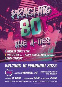 De jaren ‘80 ze waren en zijn nog steeds prachtig! Iedereen die de jaren ’80 heeft meegemaakt, kijkt met nostalgie terug naar een decennium van hoop en schitterende muziek. Fluo aerobic-outfits en (gescheurde) jeans vol buttons bepaalden destijds het straatbeeld. We nemen je graag mee naar de prachtige live muziek van toen! Koen De Smet laat jullie samen met zijn band meegenieten van dé Nederlandse pareltjes. The A-Ties olv Kurt Burgelman nemen je mee terug in deze prachtige tijd, beeld je de New wavers in lange grijze jassen en gegespte puntschoenen in. Denk aan de hits van Prince,...